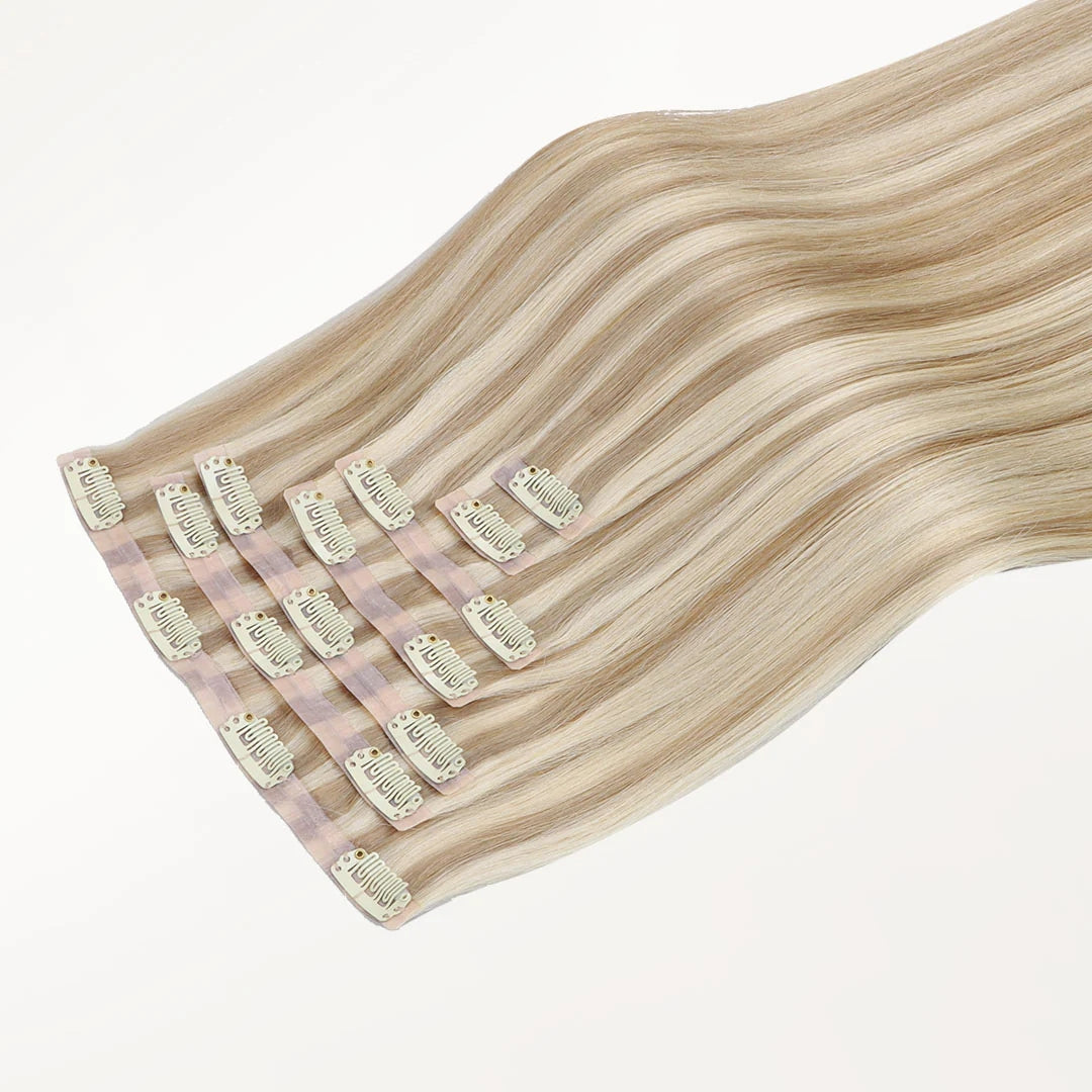 22" seamless clip in. Comes with 7 pieces, and is 150 grams.